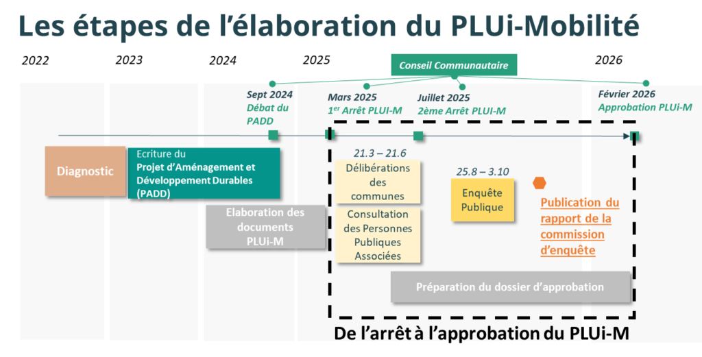 Le PLUI-Mobilité a été approuvé au conseil communautaire le jeudi 5 février 2026. Nous vous informerons de sa date d’entrée en vigueur, lorsque toutes les mesures de publicités auront été accomplies.